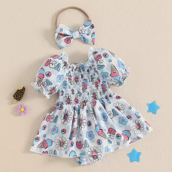 Newborn Baby Girl Fourth of July Puff Smocked Romper & Headband Set
